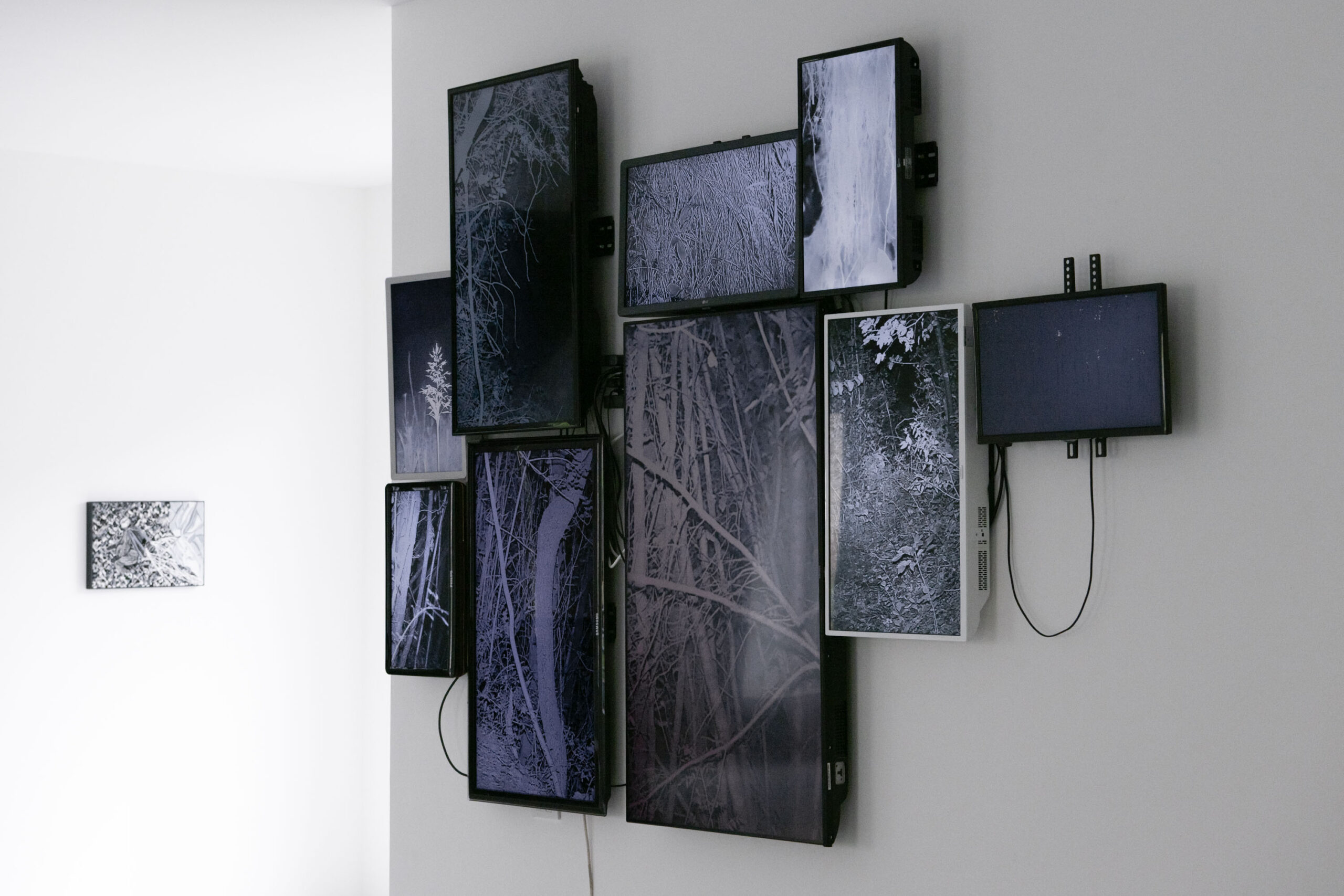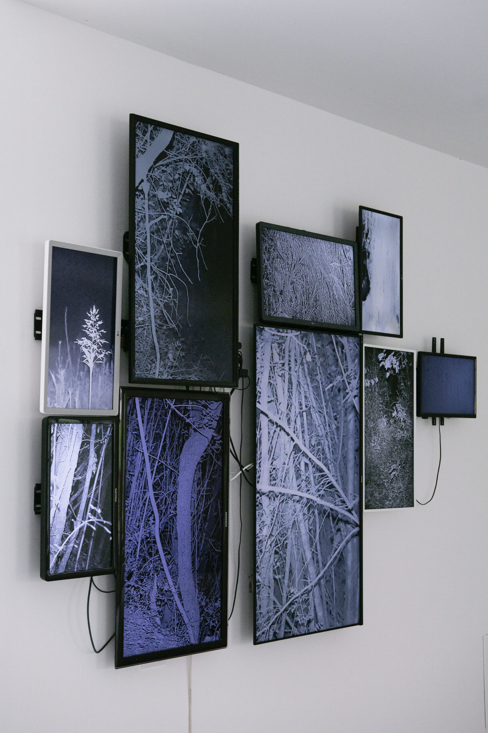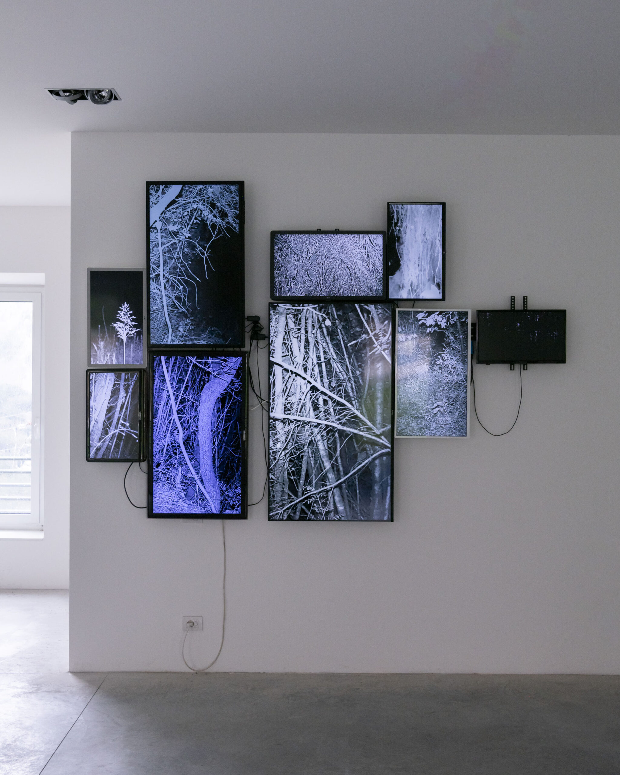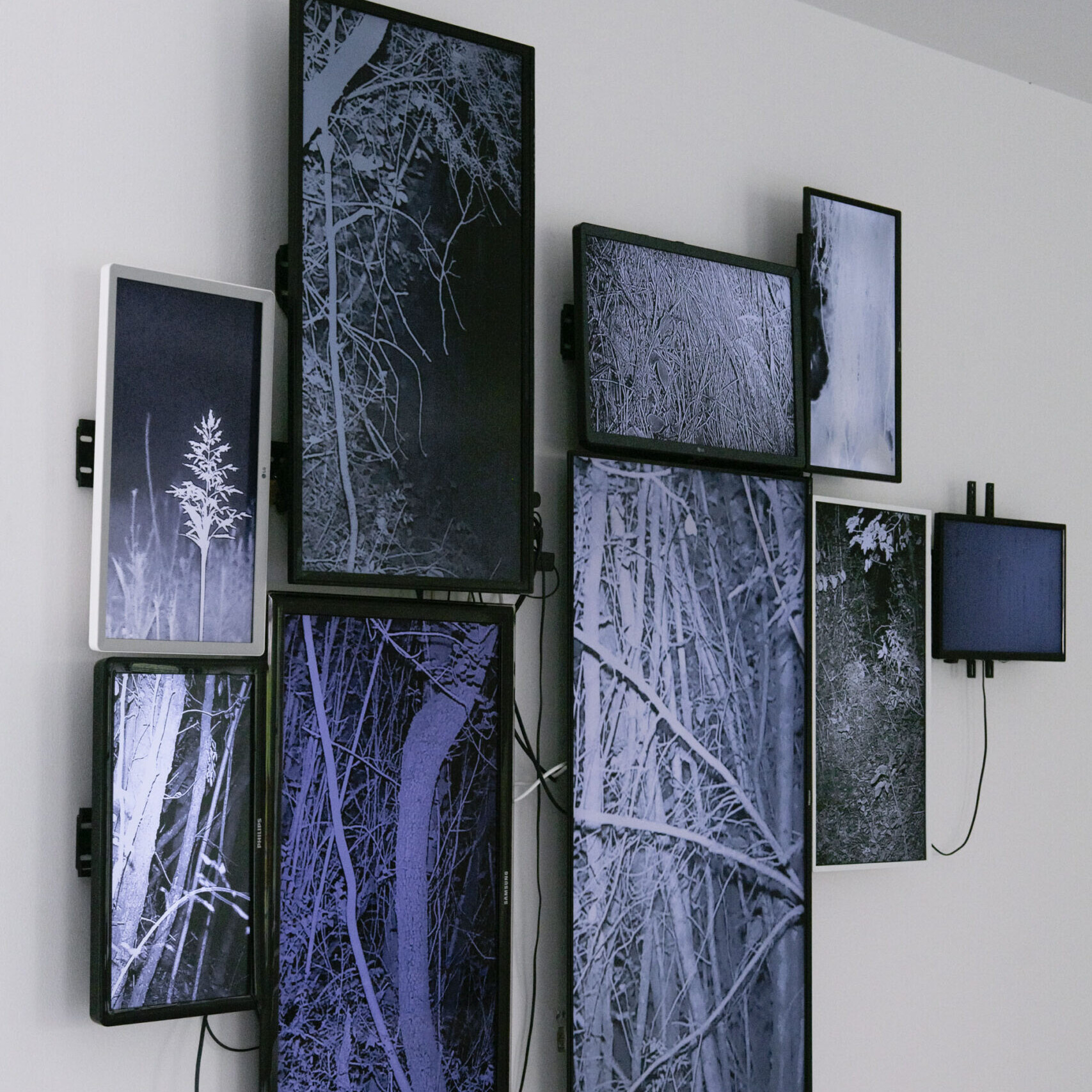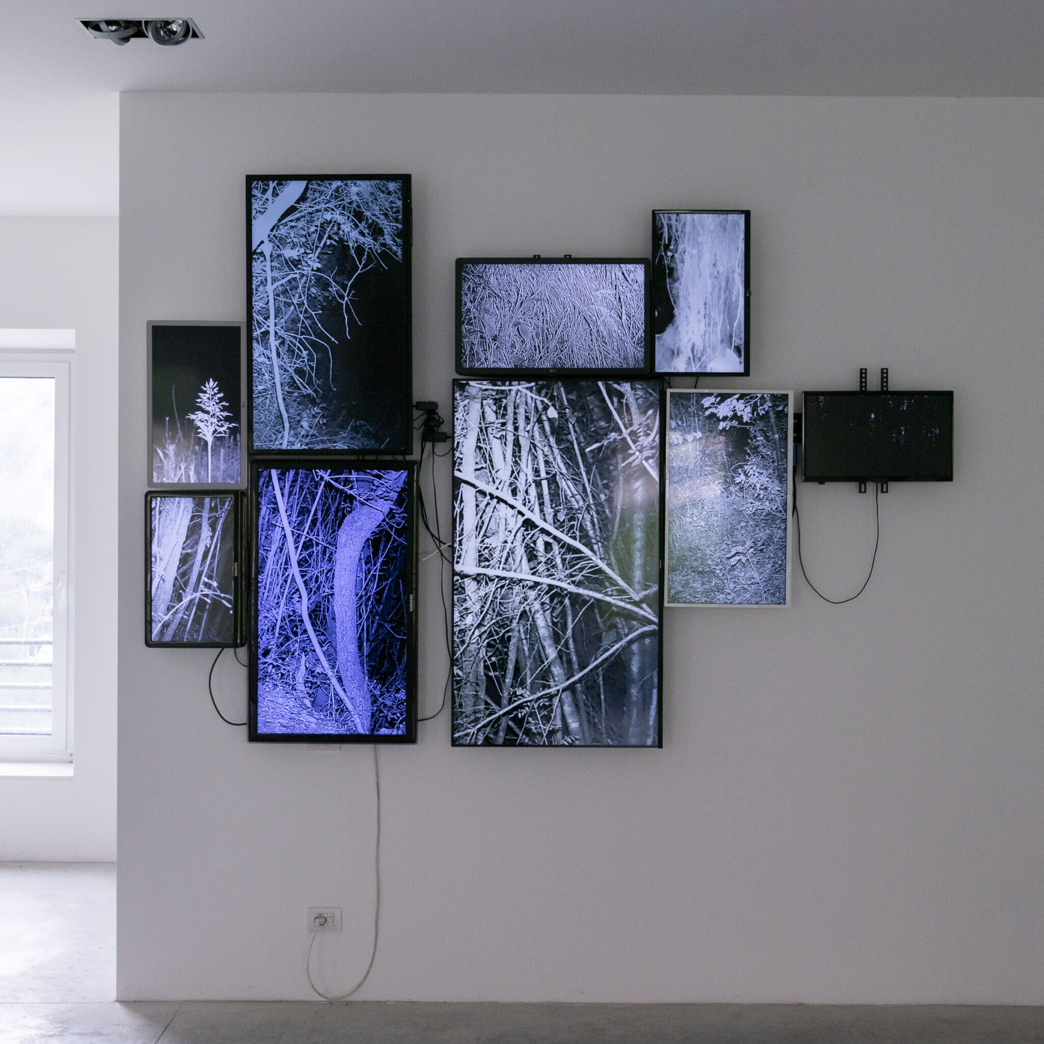 S A L V A S C H E R M O è un’installazione audiovisiva ideata come presentazione e primo intervento del gruppo VERE BESTIE. I video sono stati girati in notturna dai componenti del gruppo in diversi boschi italiani in zona Appenninica e Alpina. L’installazione segue un’ottica granulare sia per quanto riguarda la disposizione degli schermi all’interno del Nuovo Spazio di Casso, sia nella maniera in cui sono stati filmati. Frammenti di girato rimandano ad un’impressione di continuità, dialogano con le figure spettrali umane e non umane che compaiono quasi impercettibili a velocità diverse sugli schermi. Anche l’audio segue il tempo sospeso del resto dei dispositivi video, tra stasi e movimento ricorrono suoni che richiamano l’anima boschiva, oscura e allo stesso tempo digitale dell’opera.